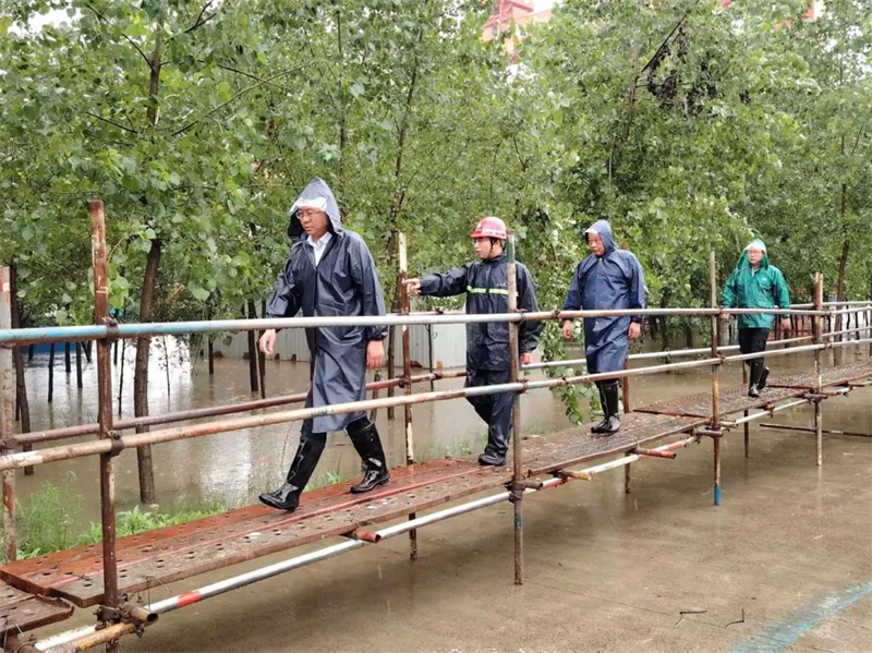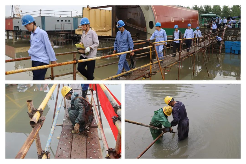 汛情就是命令,6月28日,公司迅速進(jìn)入防汛警戒狀態(tài),黨委組織召開防汛工作專題二次會(huì)議,宣布啟動(dòng)三級(jí)防汛應(yīng)急響應(yīng),防汛領(lǐng)導(dǎo)小組圍繞“確保財(cái)產(chǎn)生命安全和快速?gòu)?fù)產(chǎn)”,周密部署各部門防汛工作,建立6支黨員防洪突擊隊(duì)、7支青年突擊隊(duì)隨時(shí)待命,要求黨員干部靠前指揮,24小時(shí)輪崗值班,號(hào)召全體員工團(tuán)結(jié)一致,共克時(shí)艱。隨著防汛領(lǐng)導(dǎo)小組一聲令下,各部門黨員、團(tuán)員青年、群眾立即奔赴一線,沖鋒在前,在碼頭、閘門開展不間斷、拉網(wǎng)式巡邏檢查,險(xiǎn)情排查,切實(shí)做好防汛抗洪工作。船臺(tái)區(qū)域漫水,阻斷了前往船臺(tái)上、碼頭的道路,創(chuàng)新的蕪船人連夜搶險(xiǎn),在風(fēng)雨中用雙手和鐵架一寸寸搭建,搭出一條1200米長(zhǎng)的空中“長(zhǎng)廊”,連通碼頭、引橋和船臺(tái);為保障汛期人員安全,“長(zhǎng)廊”入口處設(shè)立哨口登記記錄出入情況。